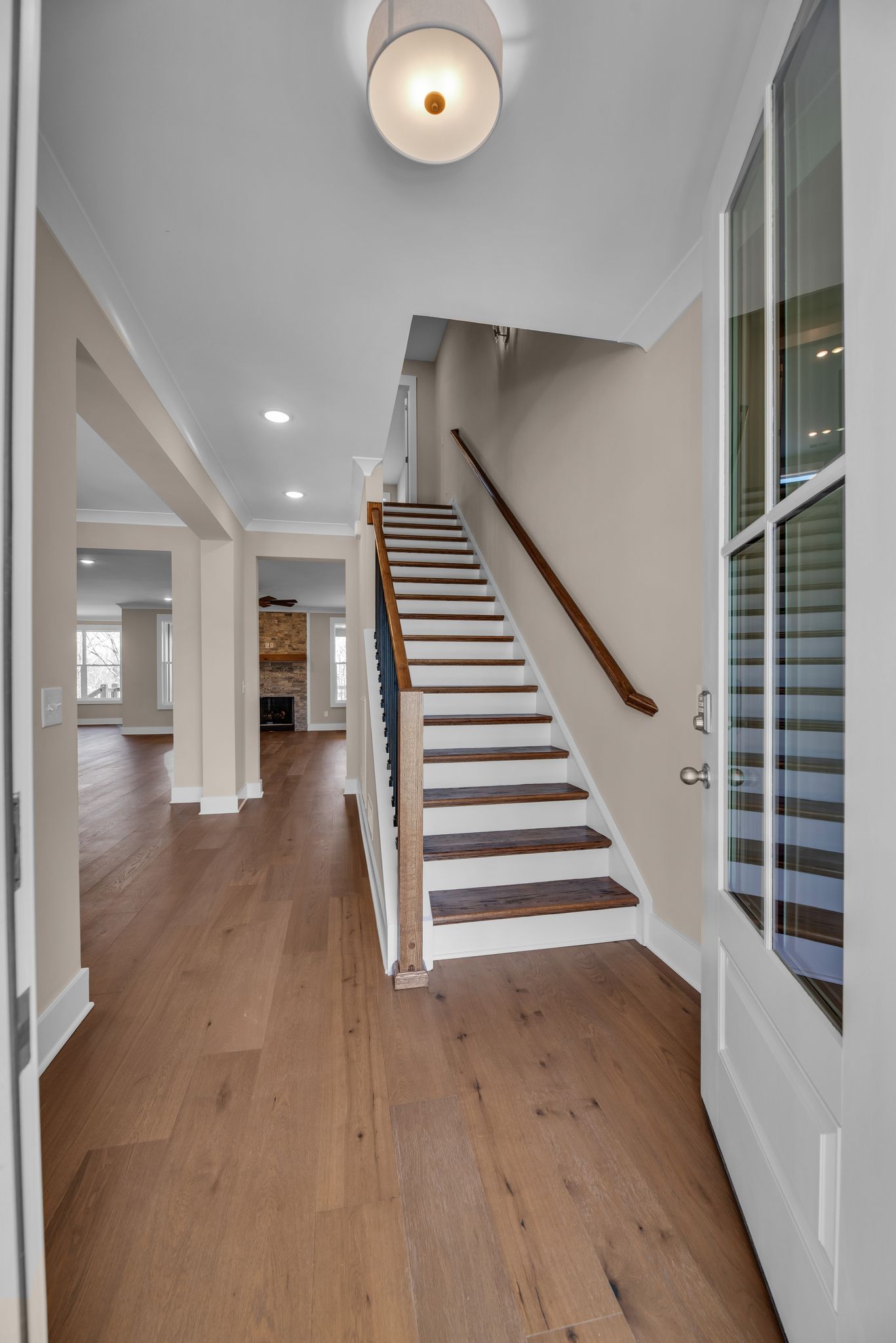 Beyond the entry, the home opens into a spacious great room designed as the heart of the main level. The great room features a fireplace, creating a warm focal point that anchors the open living space. Hardwood flooring throughout the first floor reinforces a cohesive, refined feel, while the layout allows each area to flow naturally without feeling overly open or undefined.