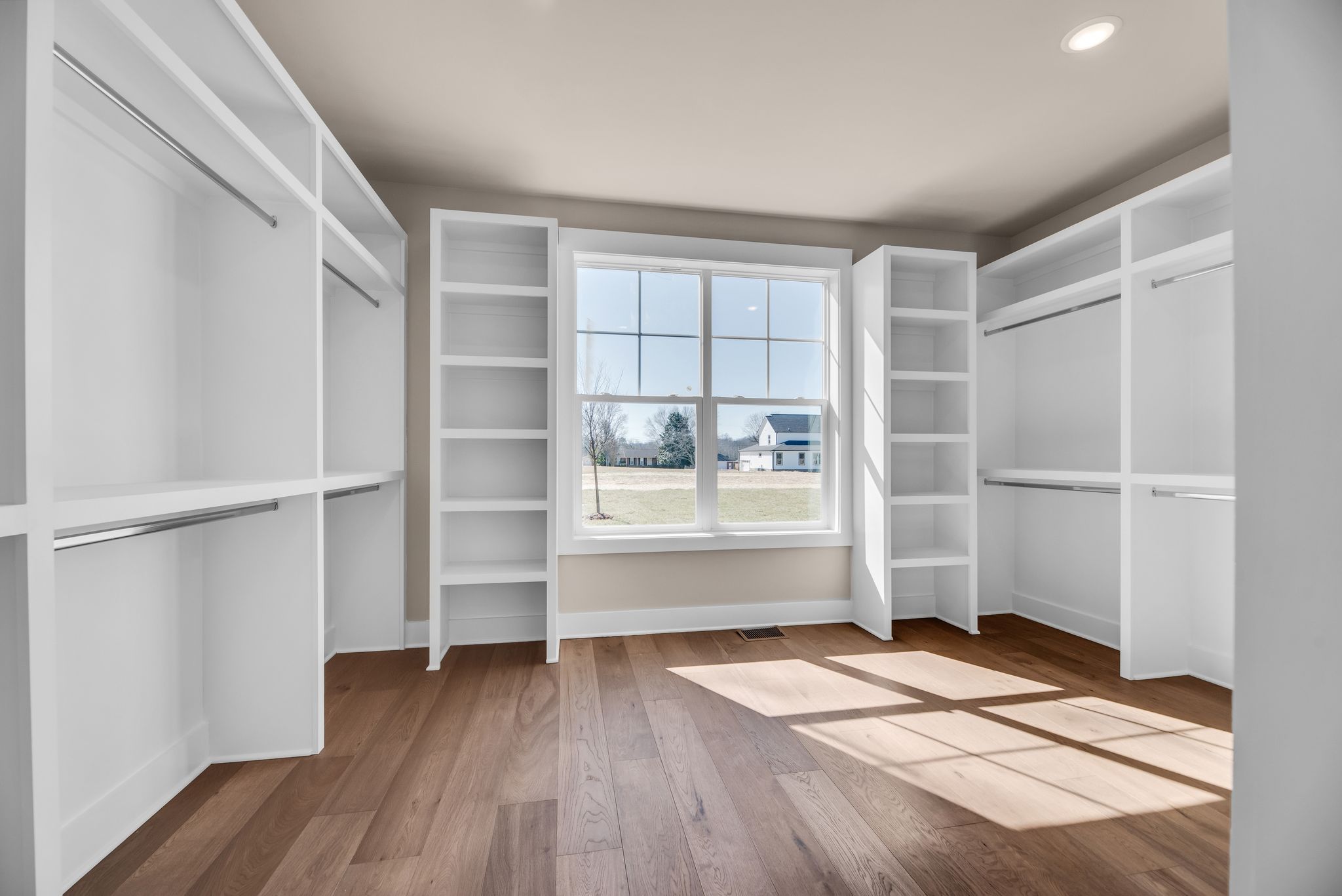 Primary bedroom walk-in closet with custom shelving