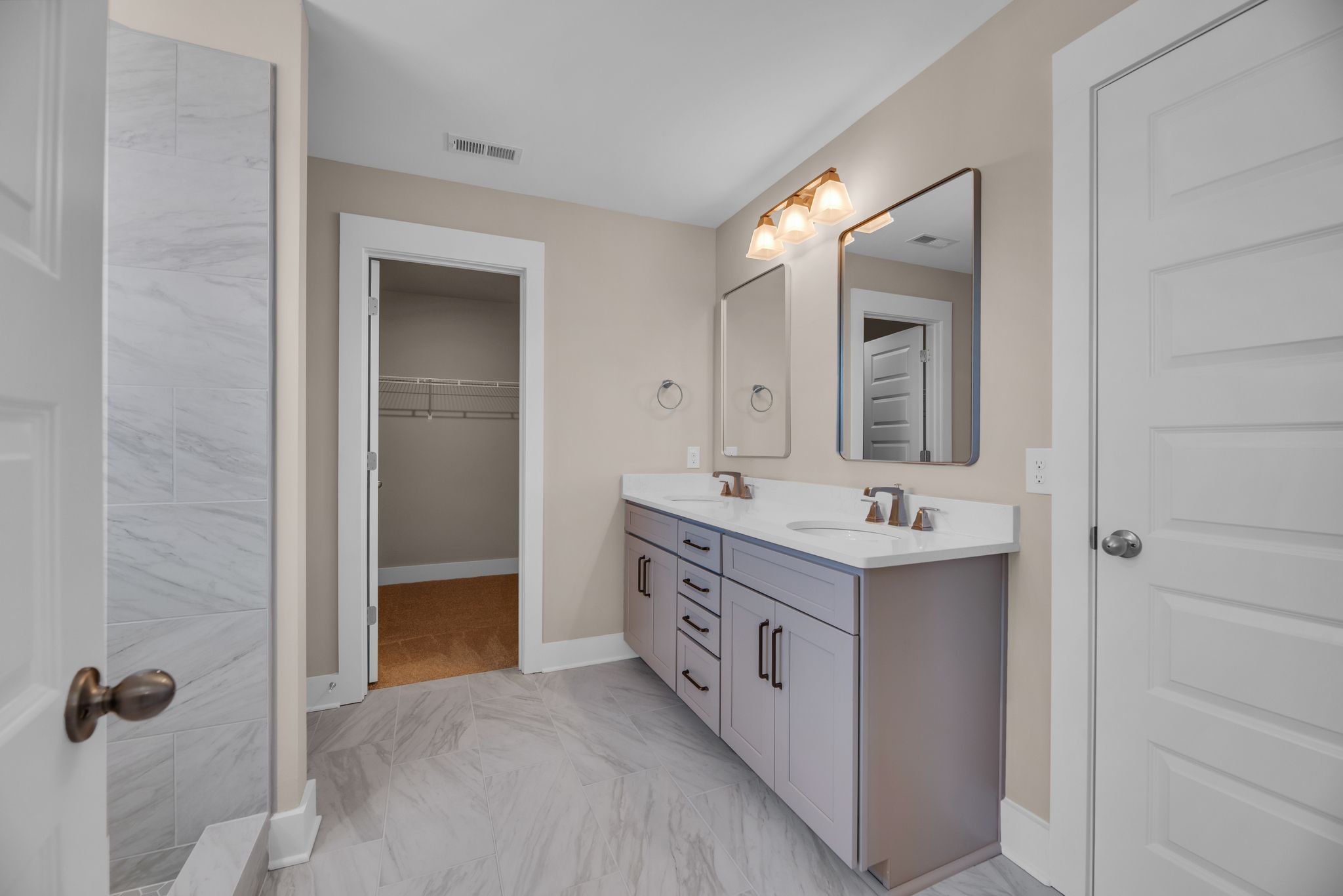Fourth bedroom en-suite bathroom with twin sinks, walk-in shower, and walk-in closet