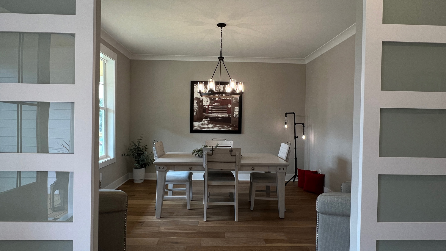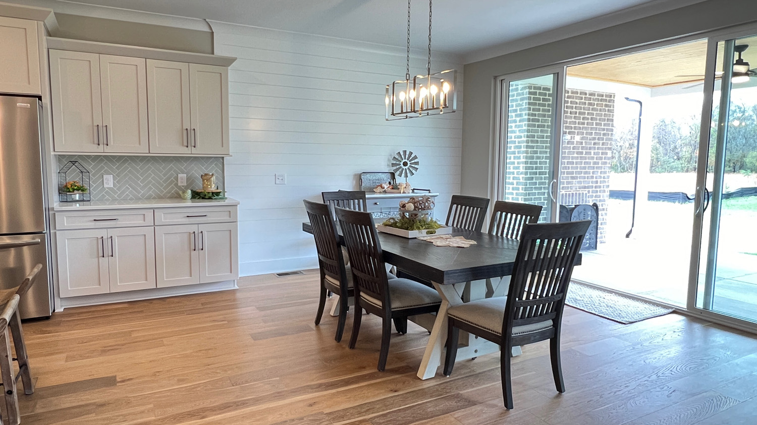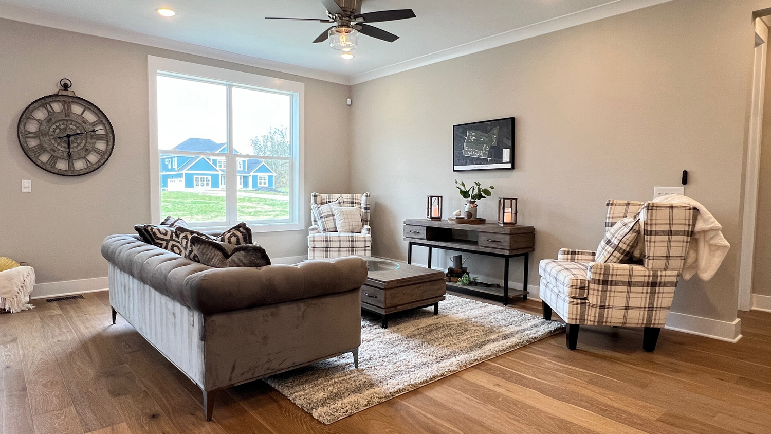 Hardwood floors run throughout the first level, catching natural light from expansive windows. The proportions feel generous but not overwhelming — designed for real gatherings, real evenings, real life.