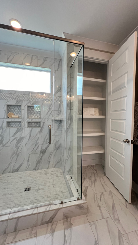 Primary bathroom walk-in glass shower and linen closet